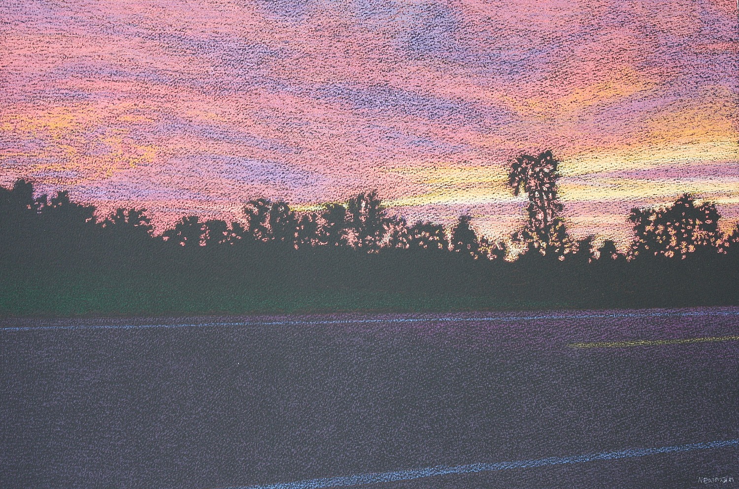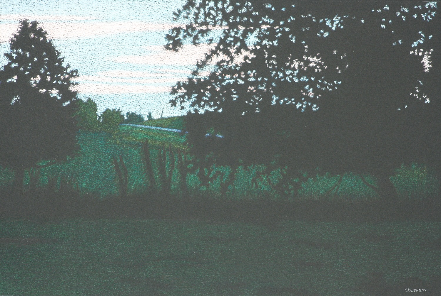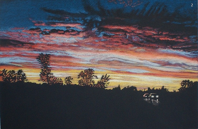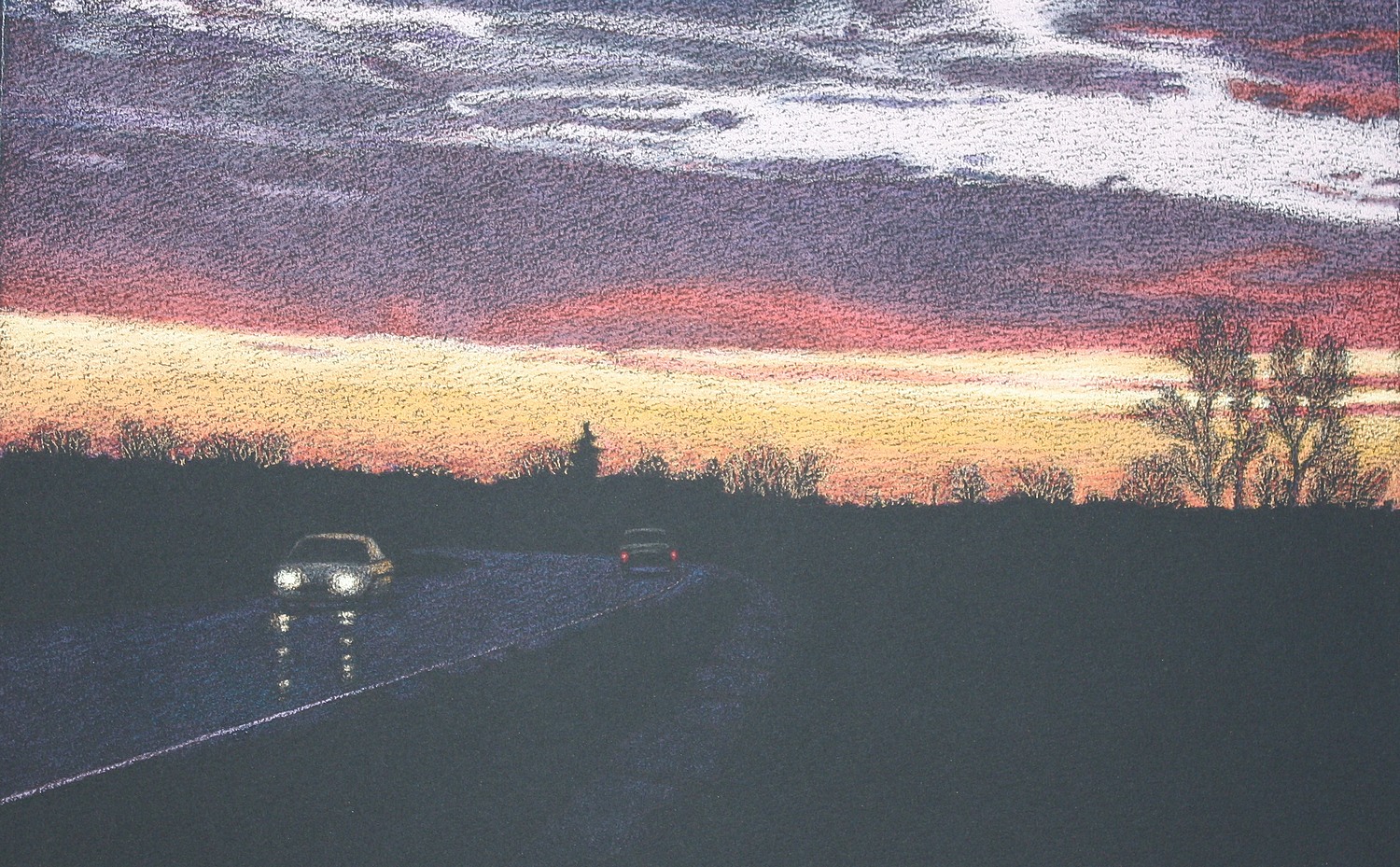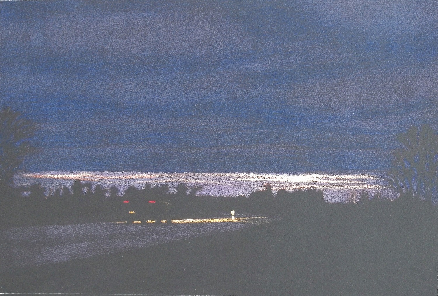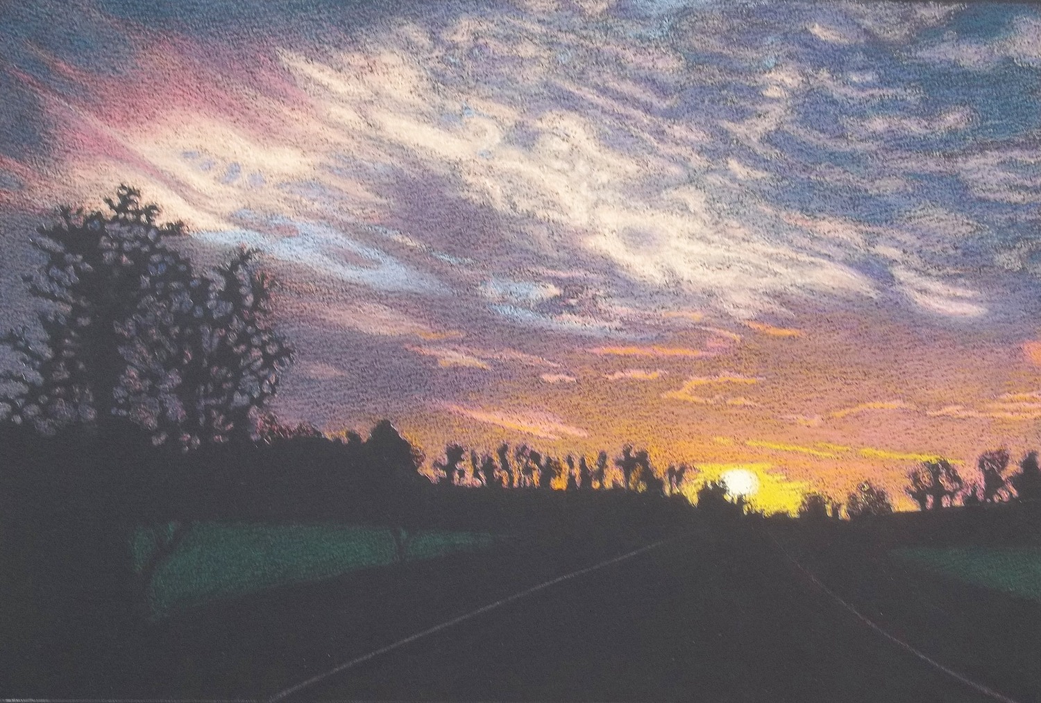 When I began drawing landscapes I soon settled on pastel on black paper as the medium I wanted to use. The black of the paper enriches and enlivens the colours of the pastels. In contrast with watercolour, where the paper becomes the lightest colour, in pastel the black paper becomes the darkest hue.