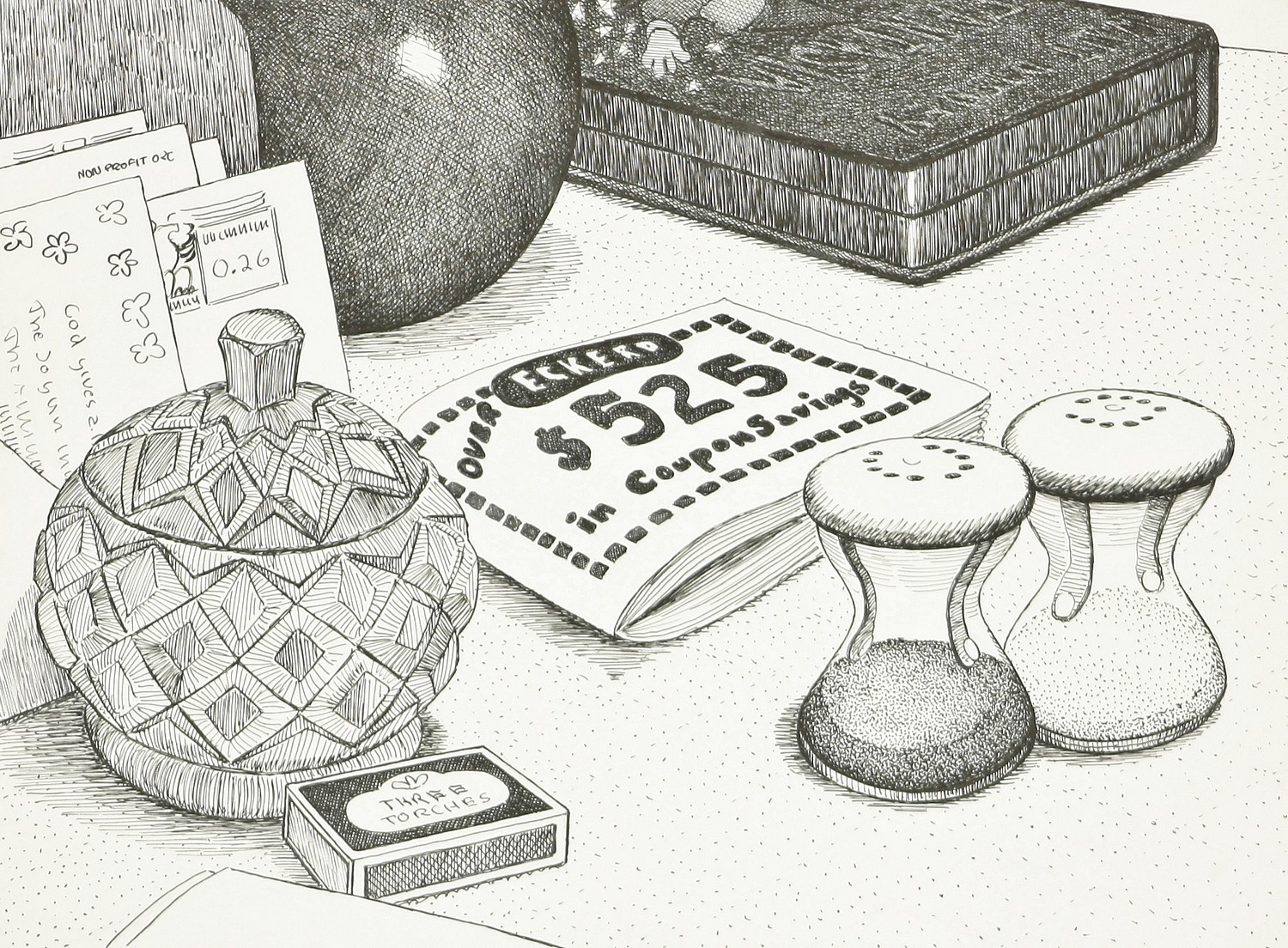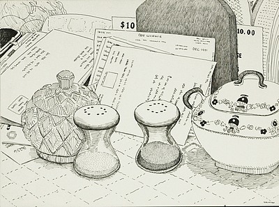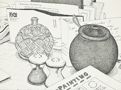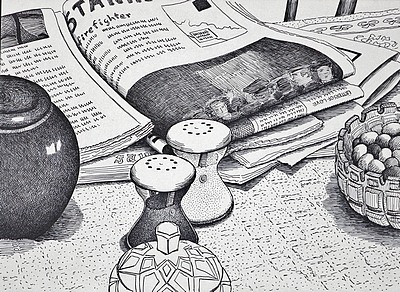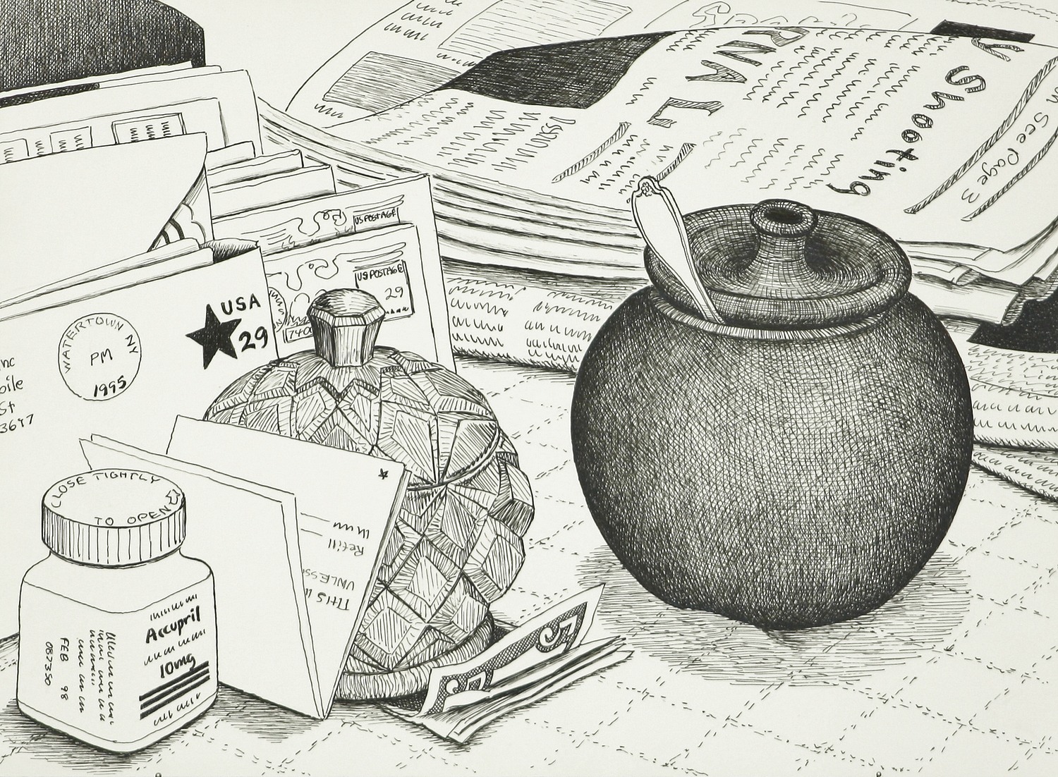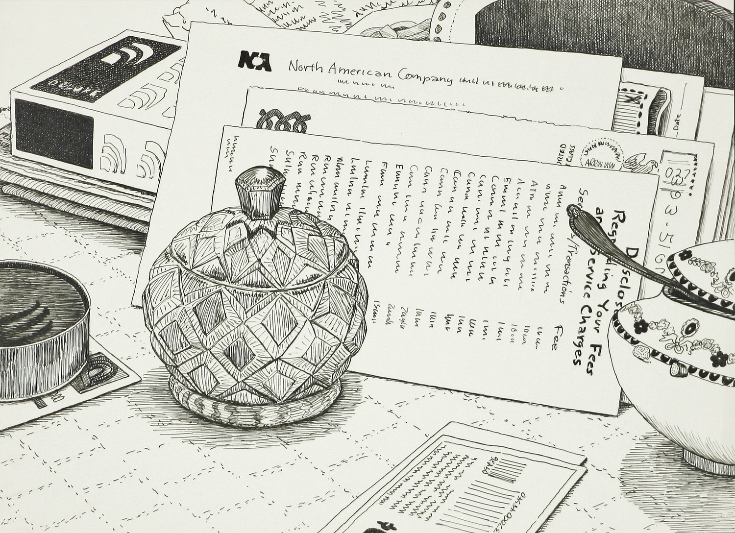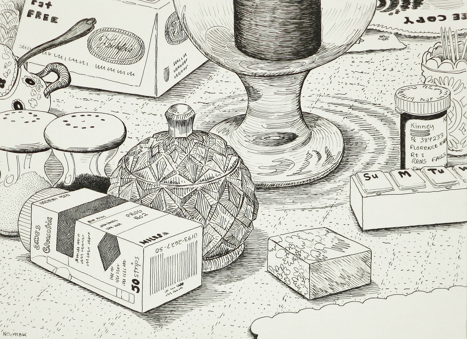 These small pen-and-ink still lifes depict the chance compositions that briefly come together in the course of our everyday activities. I wanted the style of the drawings to reflect the casual way in which we see these subjects floating on the edges of our awareness. Using only a very minimal pencil sketch as a guide, I try to preserve the feel of a sketch with an improvised free-form approach, sort of like jazz.
