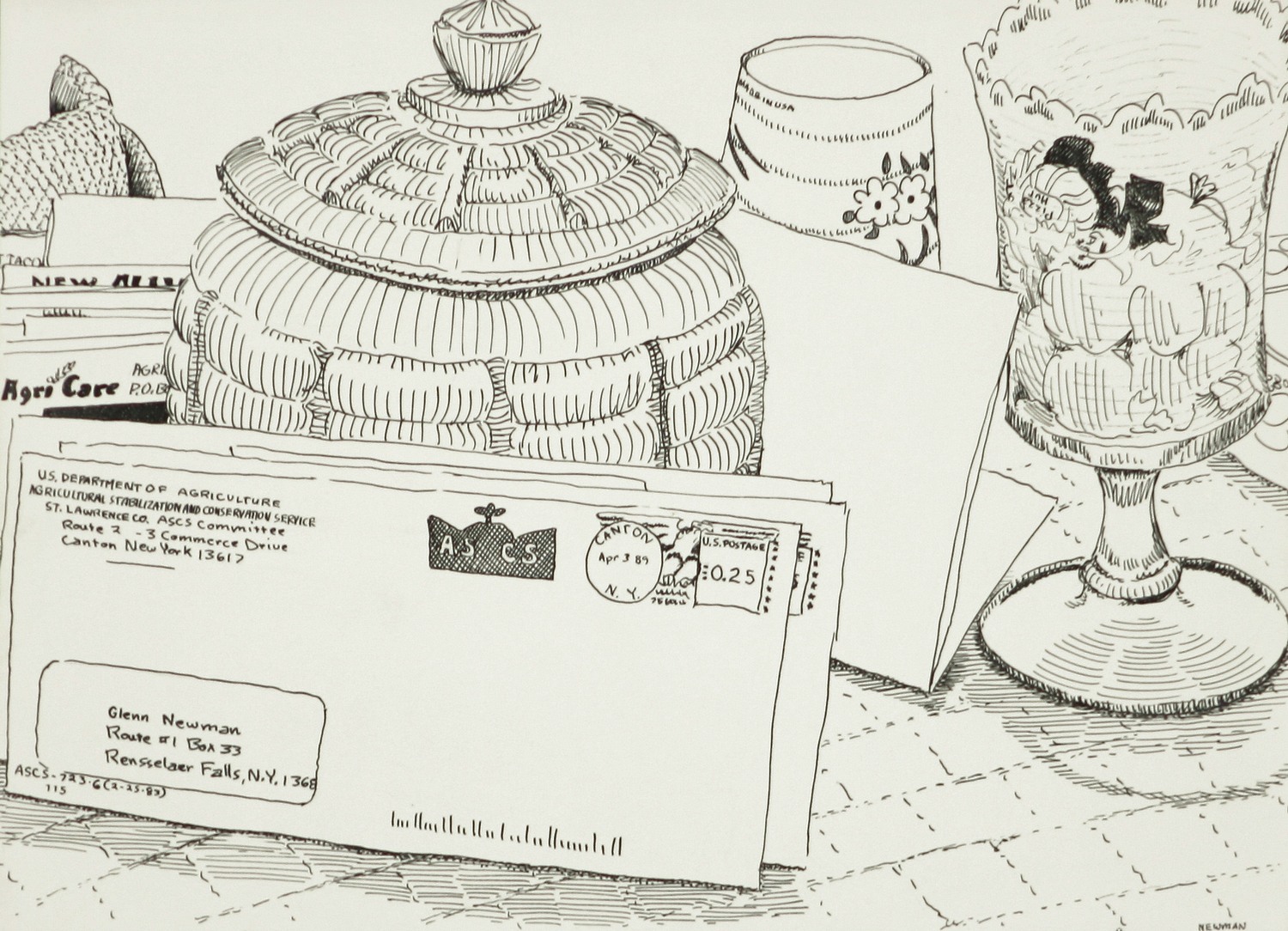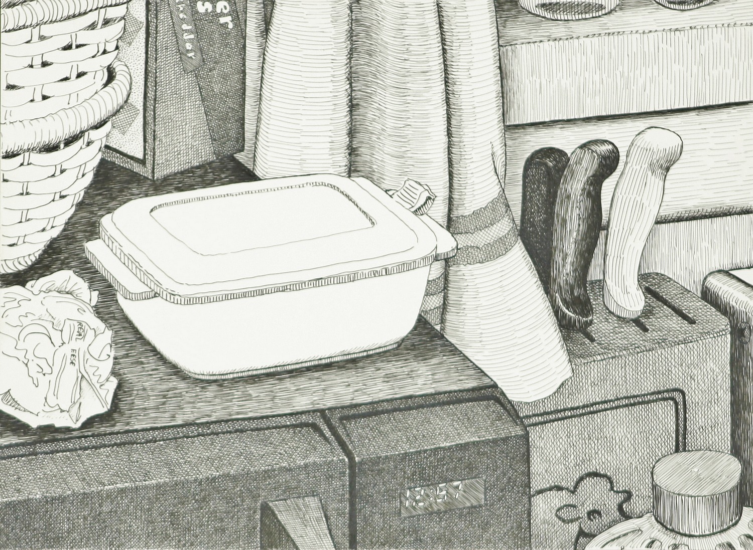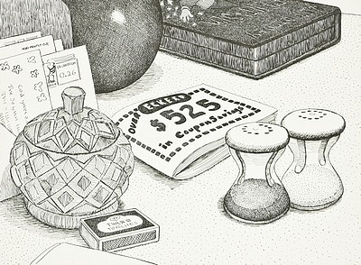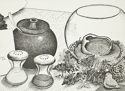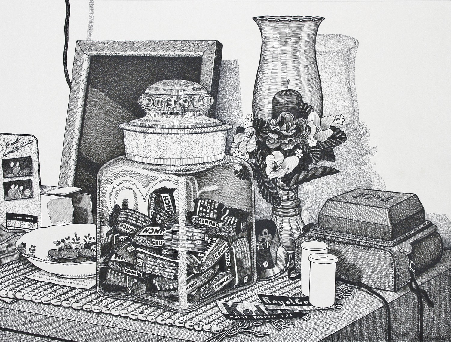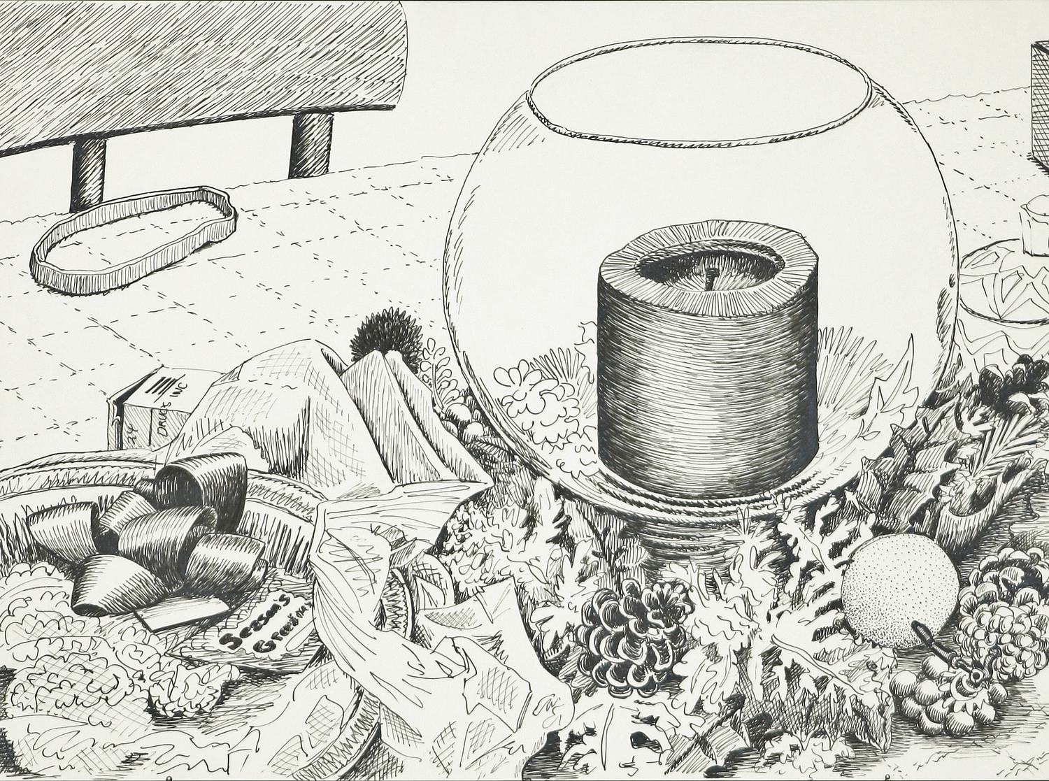 These small pen-and-ink still lifes depict the chance compositions that briefly come together in the course of our everyday activities. I wanted the style of the drawings to reflect the casual way in which we see these subjects floating on the edges of our awareness. Using only a very minimal pencil sketch as a guide, I try to preserve the feel of a sketch with an improvised free-form approach, sort of like jazz.